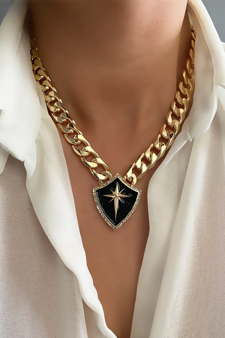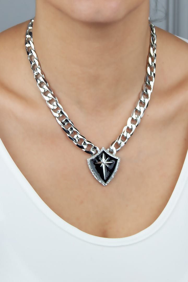 Necklace is rhodium plated, you can use it without tarnishing, The black parts on the tip used are created with a special enamel technique, the stones used in the decoration are zircon. The length of the necklace is 16.5 inch.