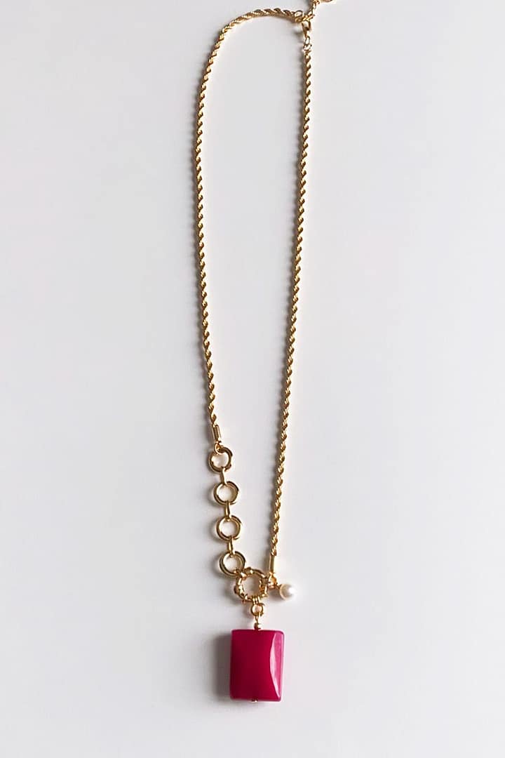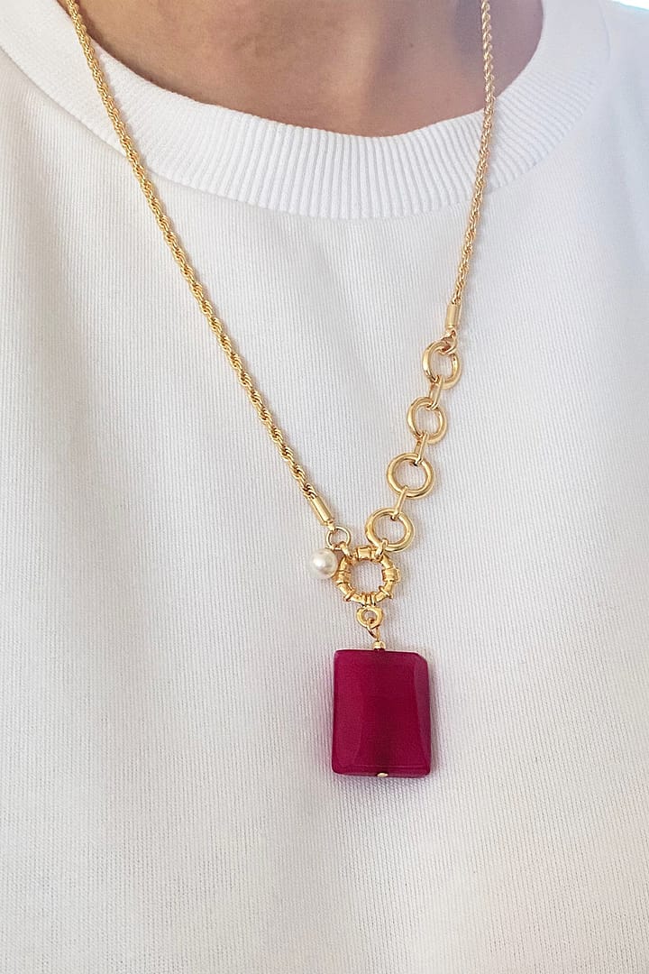 It is of jeweler quality with its workmanship and appearance. Stone cuts are like the original. It has a special jewelry lock mechanism. Gold lacquer plated. The length of the necklace is 15.7 inch.