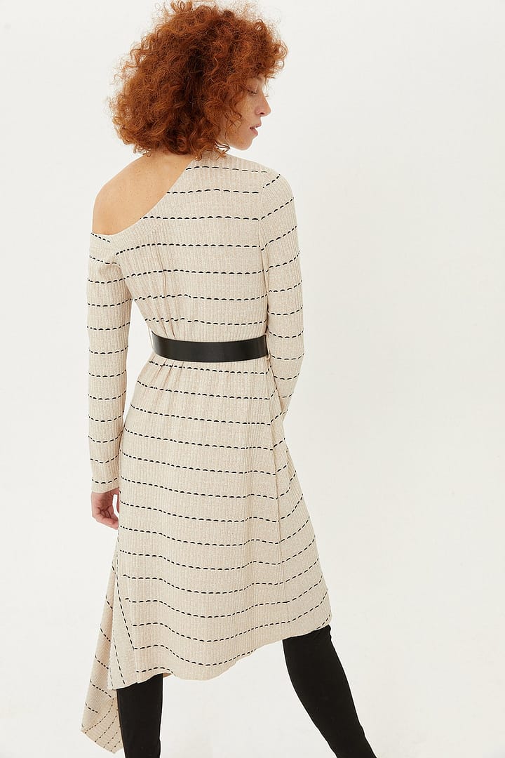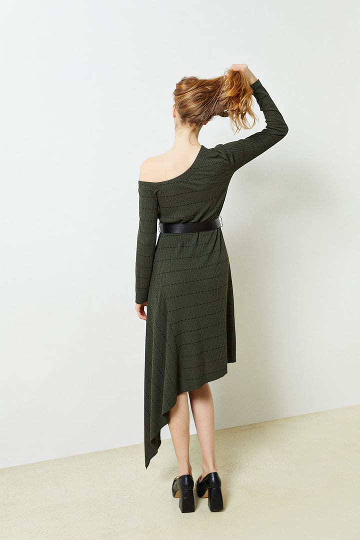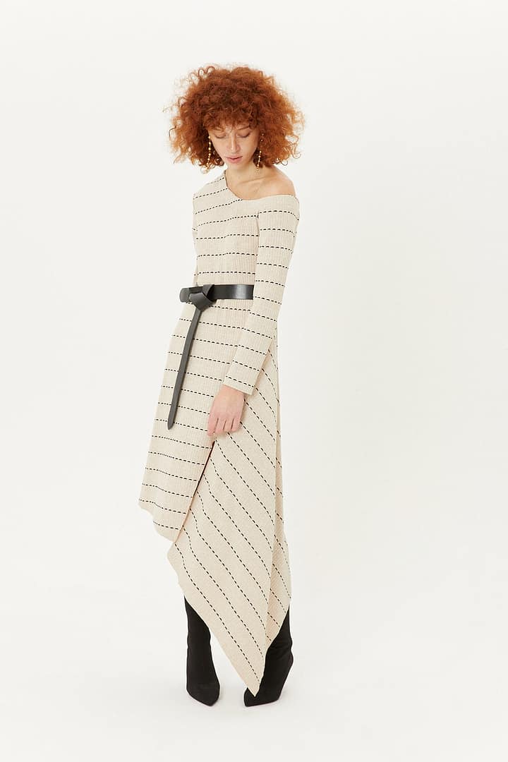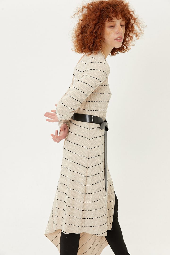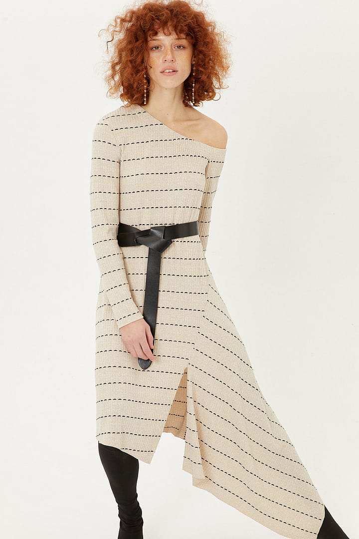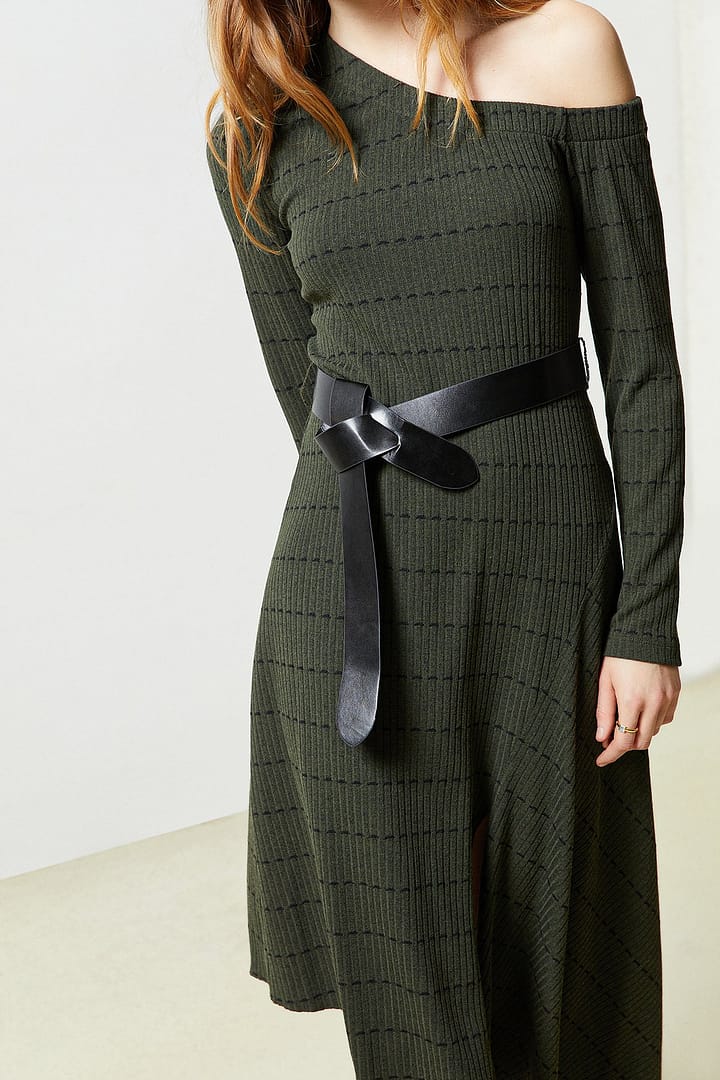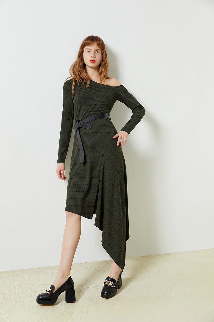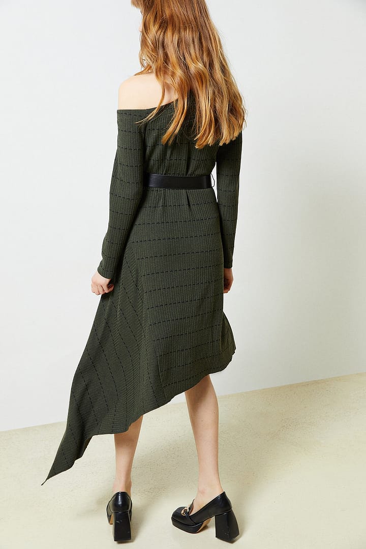 Long Sleeves Asymmetric Cut Belted Midi Dress