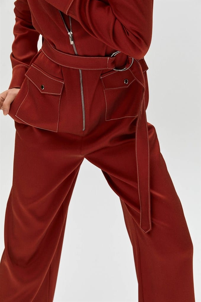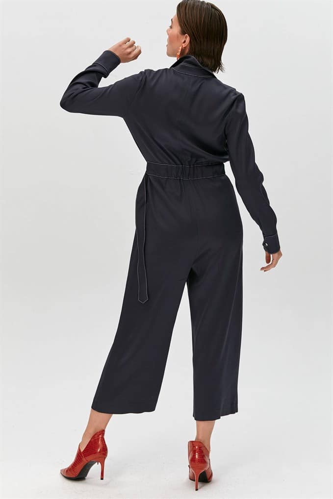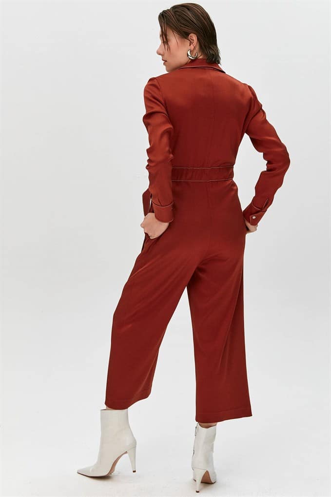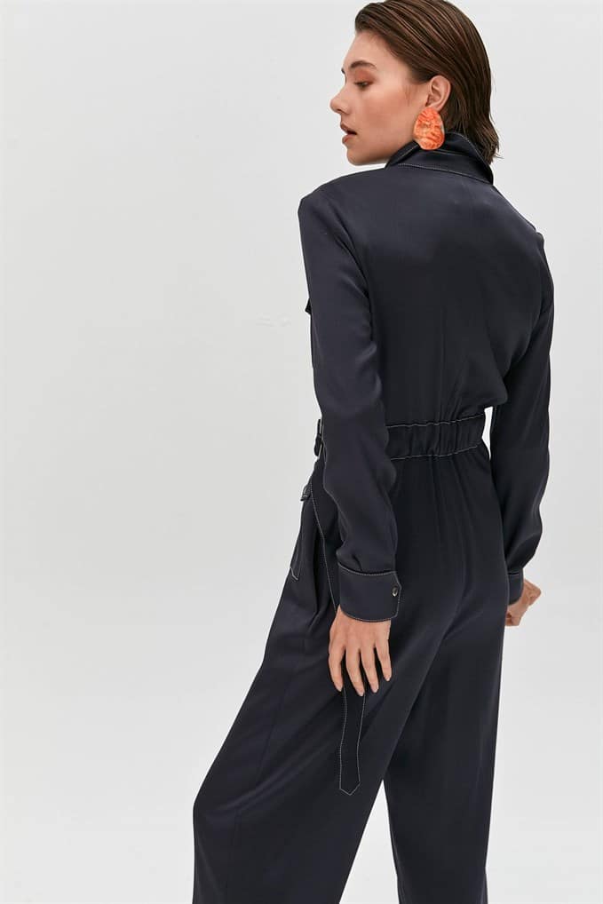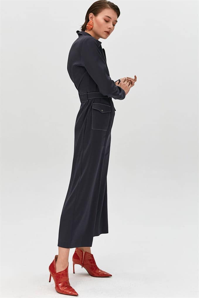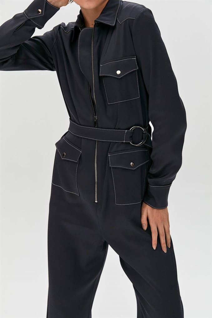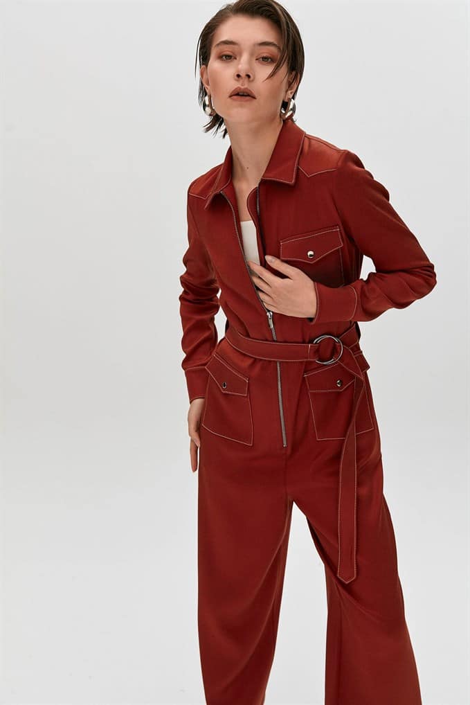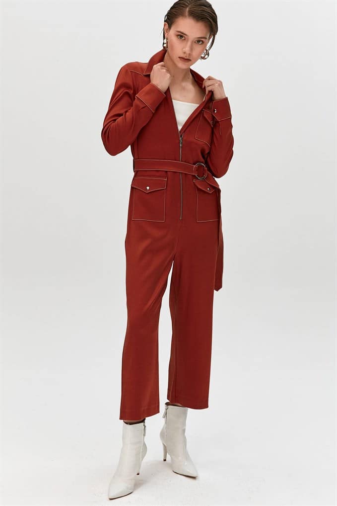Collared Jumpsuit Featuring Long Sleeves, Flap Front Pockets, A Matching Belt With Buckle And Metal Zip Fastening.  %66 Acrylic %26 Viscon %5 Wool %3 Elastan