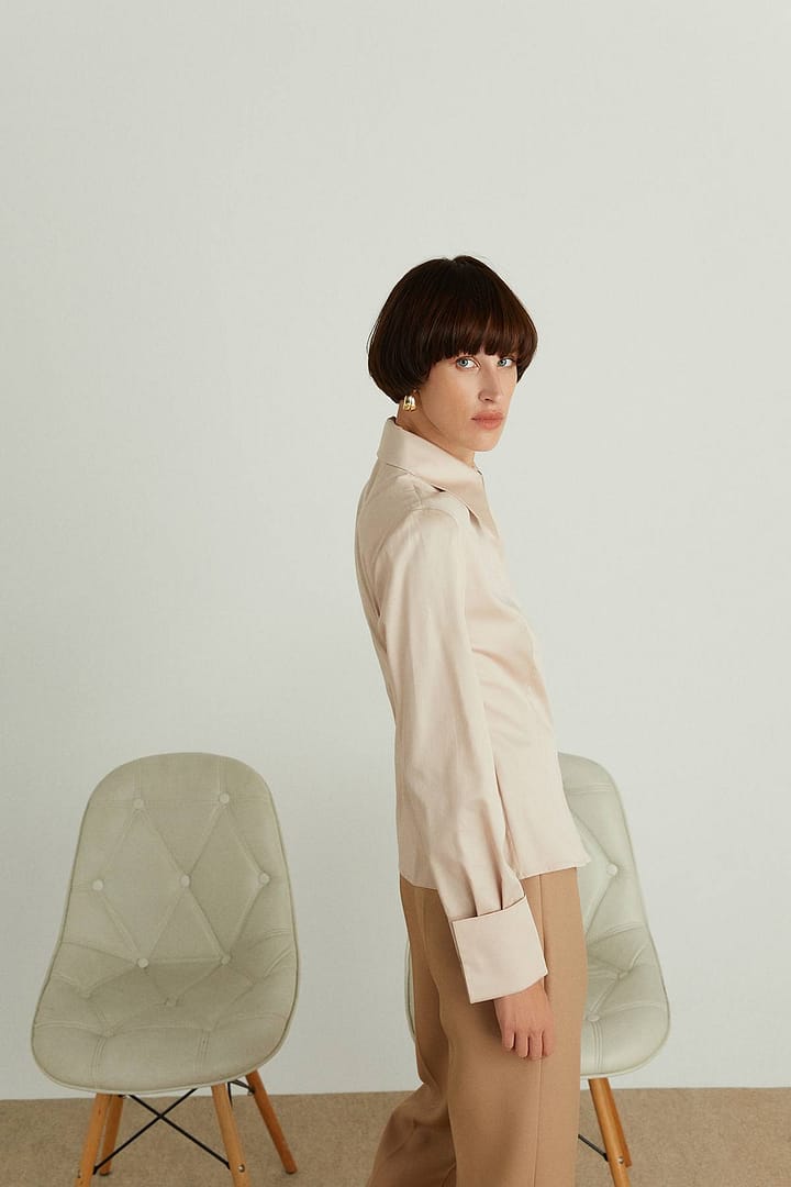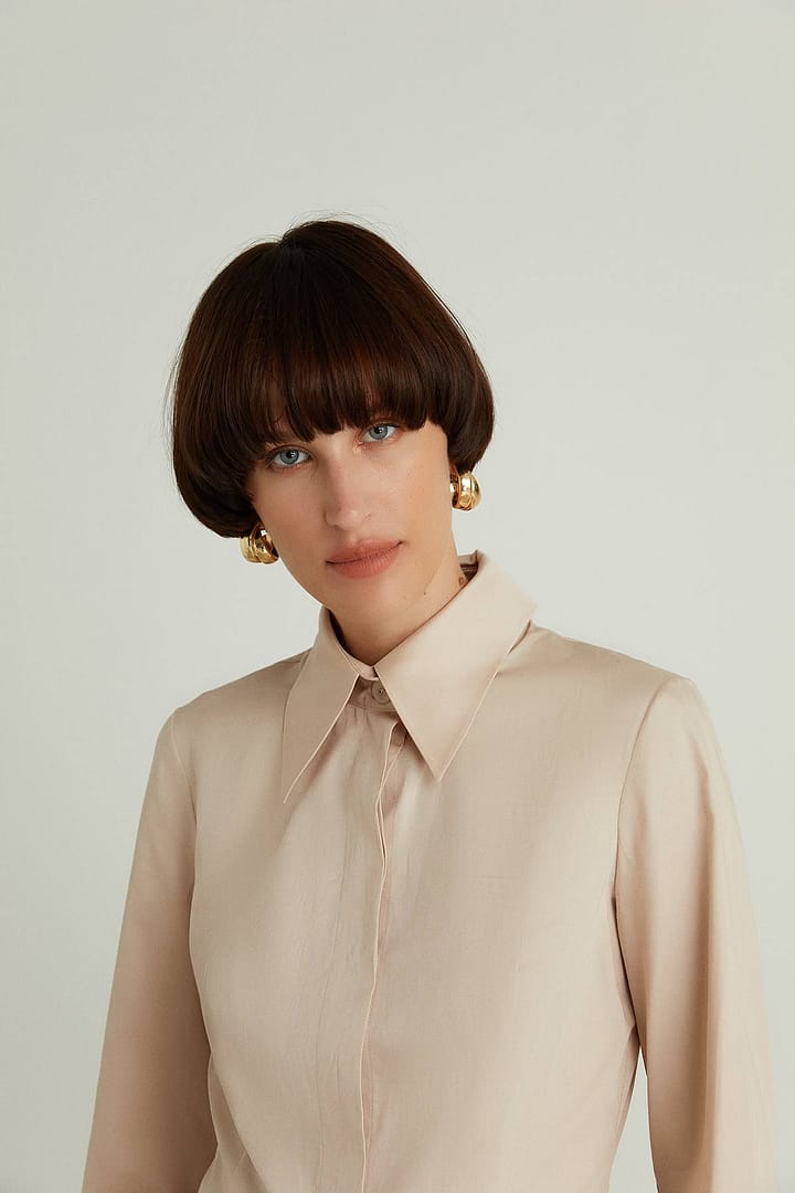 | Oversize Collared Shirt With Long Cuffed Sleeves. Featuring Rolled-Up Up Hems. Model: Height: 180 Chest: 85 Waist: 61 Hips: 89/36 %100 Cotton |